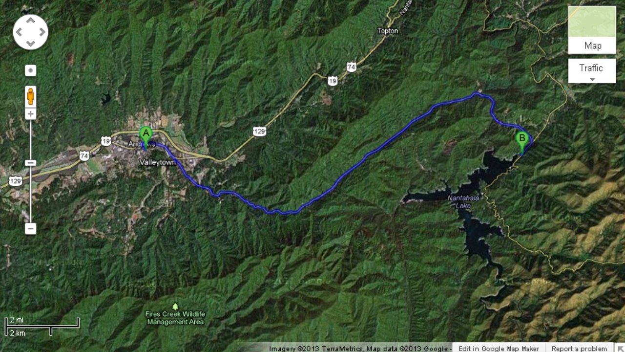 Trail InformationThis bike route is park of NC Bike Route #2, Junaluska Road, which leads to Franklin, NC and east.Departing from downtown Andrews, ride south on Bristol Avenue to turn left onto Aquone Road. Next, junction with Junaluska Road 1 mile. Travel through Valleytown subdivision, then along Junaluska Creek 10.1 miles to the turn off to Nantahala Shores subdivision located on Nantahala Lake. You will be in awe of beautiful creekside, mountain, and rural views. The grade is a relatively constant 6-7% with steeper grades in the curves. Elevation gain from town to the gap is 2000 feet. The route is then downhill to the lake, which is one of the most beautiful and pristine of any in the southeast. Return is reverse. The total distance of 20.2 miles is a relatively difficult one-way trip, both ways. Traffic may be moderate, especially on weekends. More information |
